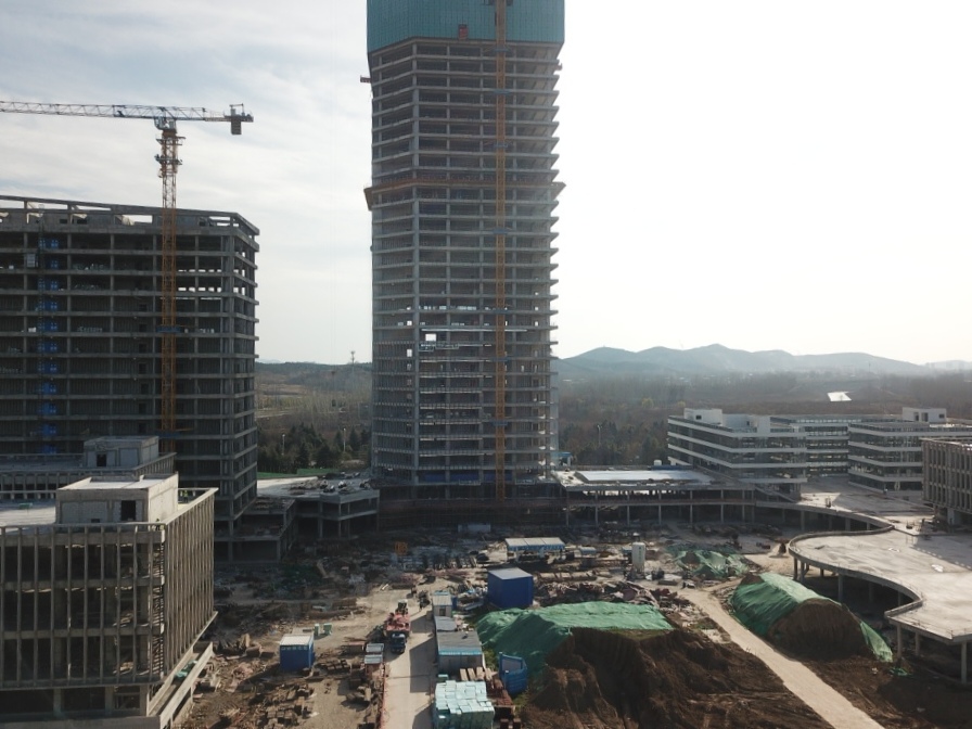 淮北第一高樓——商務(wù)政務(wù)中心采用框架核心筒結(jié)構(gòu),建筑面積超7萬平方米,設(shè)計復(fù)雜、施工難度大,地下室出正負零后以平均7天一層的速度向上生長,工程部副部長張玉坤駐點管理,項目在做到質(zhì)量、安全雙優(yōu)的同時,以不到一年的時間實現(xiàn)封頂,刷新淮北速度。項目不僅提前完成了年度節(jié)點目標,而且先后獲得2020年“安徽省建筑安全生產(chǎn)標準化工地”、“全國AAA安全文明標準化工地項目”的省級、國家級榮譽,在全市范圍內(nèi)先后召開了兩次市住建局主辦的建筑質(zhì)量安全現(xiàn)場觀摩會,下一步將爭創(chuàng)“黃山杯”及“國優(yōu)”工程,做到進度、質(zhì)量兩不誤。目前南區(qū)各主樓結(jié)構(gòu)已全部封頂,二次結(jié)構(gòu)、安裝工程完成70%,即將進入幕墻和裝飾裝修穿插施工階段。